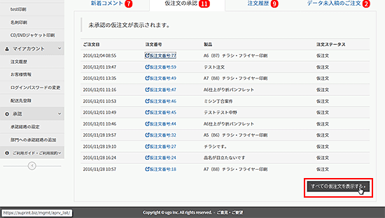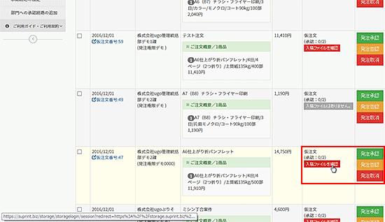 各注文の商品概要の一覧・ご注文金額・入稿データの有無、承認処理ボタンの一覧が表示されます。