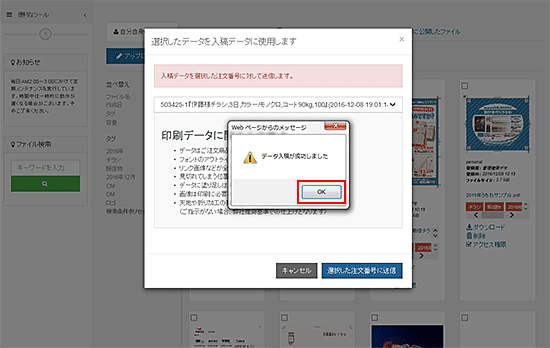 入稿処理が終了するとダイアログが表示されます。